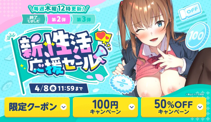 3月26日12時から、待ちに待ったFANZAコミック100円セール(新性活応援セール)の第二弾が開始されたぞ!!